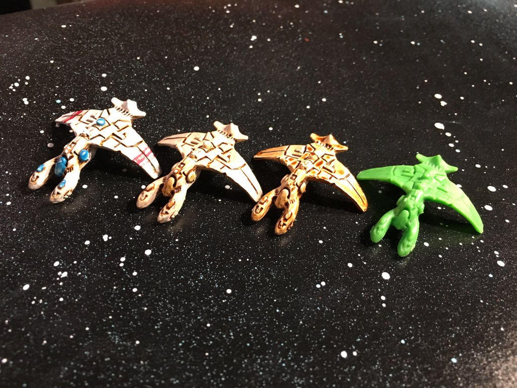 I found a bag of plastic spaceships at the dollar store (I think they’re party favors) which were perfect candidates to be painted up as cruiser warships. The tiny fighter craft are from an old Buck Rogers boardgame I found online (I think a bag of 100 was around $9 USD).