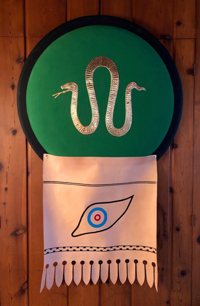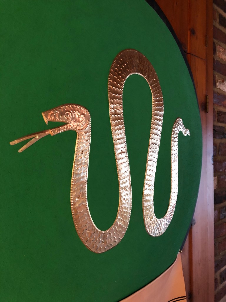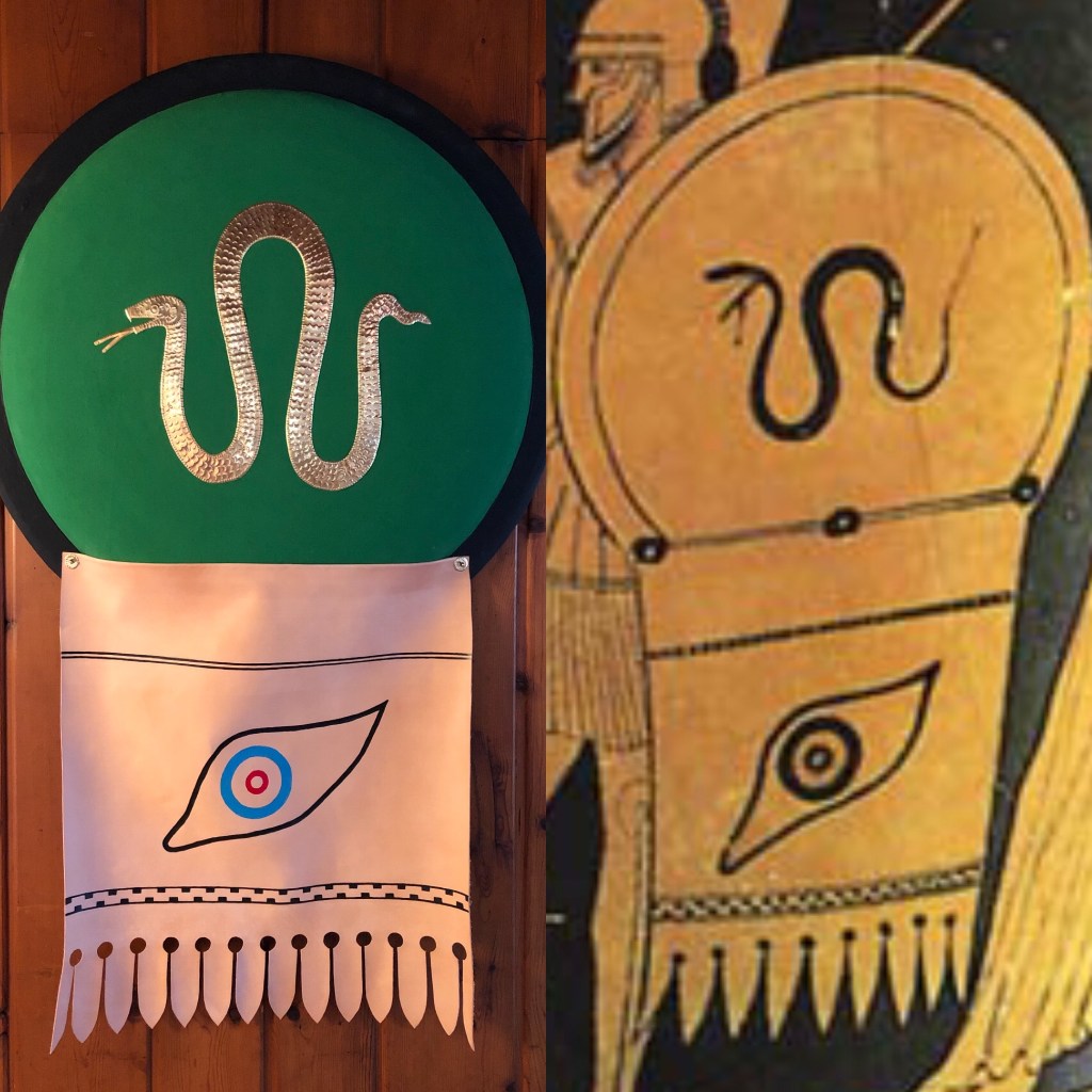 Wood core, covered with fabric, brass furniture, sheep hide, rope, and leather. Hand cut and hammered snake blazon made from brass, patterned after a design on a Greek vase (bell krater). Blazon attached to shield using tiny brass nails.