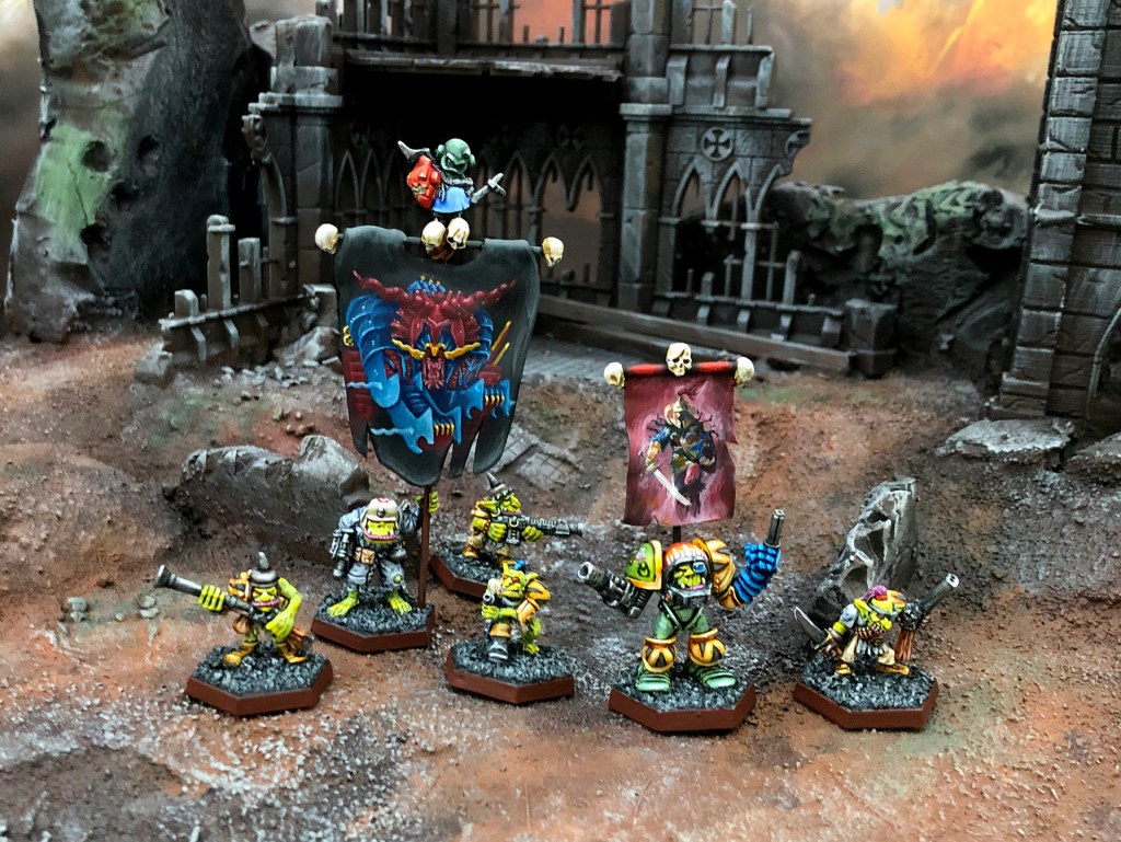 This month I was away from home for a couple weeks. When I entered the challenge I planned my painting block for this month to be something I could manage around my travel schedule. My plan for the month was to paint the warboss (Kor Sparktoof), his 4 gretchin assistants, and the army standard bearer.