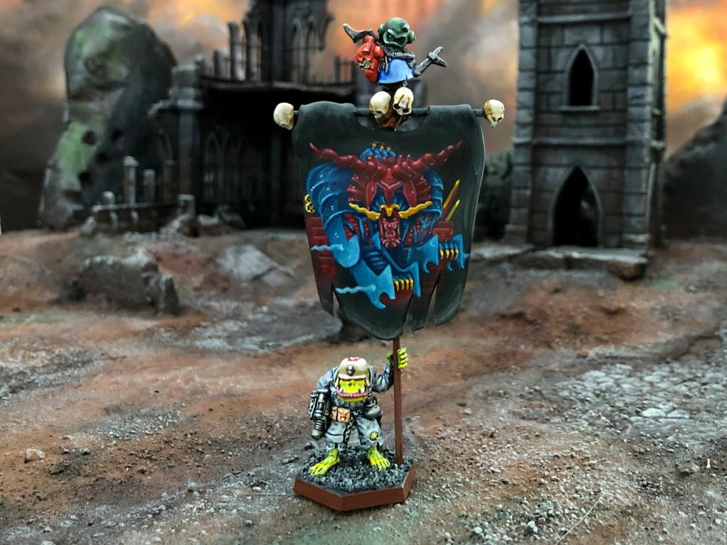 As is usual for Kor, he displays his motivation proudly in his personal livery of Judas Priest art. I built his back banner from styrene shaped over a flame, drilled a few bullet holes, and painted it with the classic Melvyn Grant art from Judas Priest’s 1981 album “Hero, Hero.” I’m particularly proud of his back banner, considering it’s around 20mm X 30mm. His Gretchin assistant with the knife, shotgun, and eye patch is my favorite greenskin sculpt of Warhammer 40,000, of any edition.