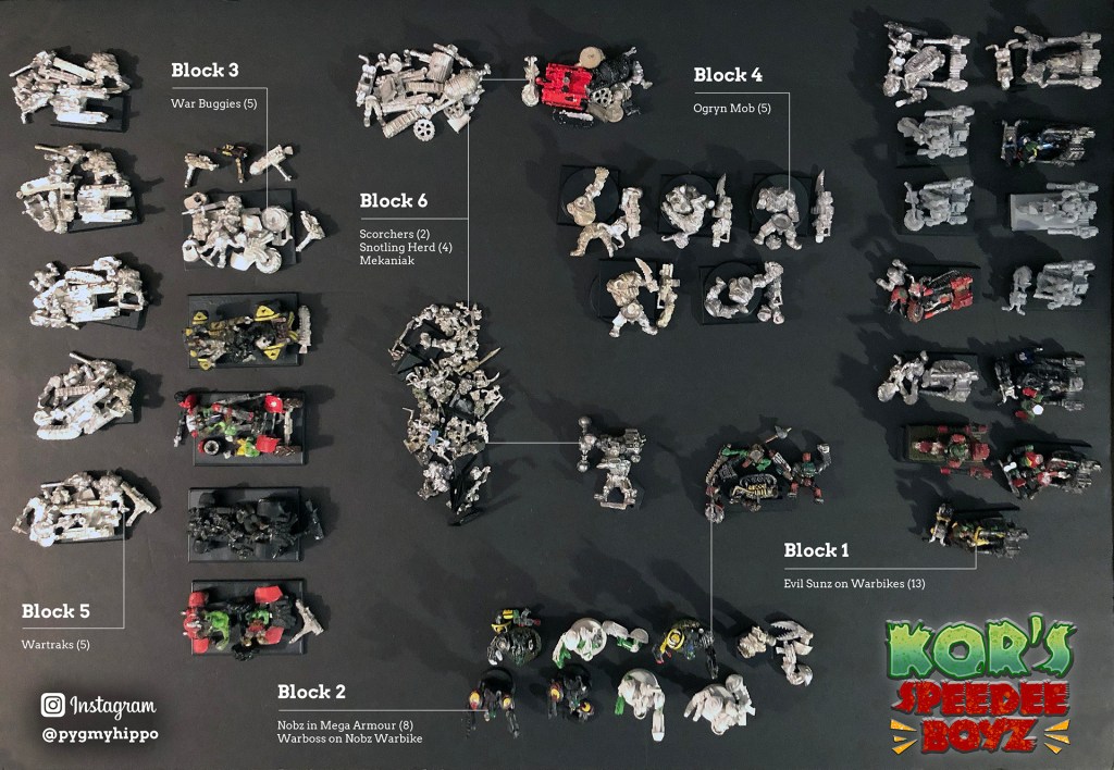 Vehicles galore! The final block is finished, and what a relief it is. Another set of vehicles for Kor’s fast attack force. I painted up 5 wartracks and 1 scorcher. Initially I planned on painting 2 scorchers, but during assembly I realised that I’m missing 2 parts for the second scorcher (the driver’s legs and a rear wheel for the towed fuel tank). Upon further reflection, I think I used that missing rear wheel when I made the hop splat gun a couple months ago. I’m sure I’ll come across more parts somewhere down the line.