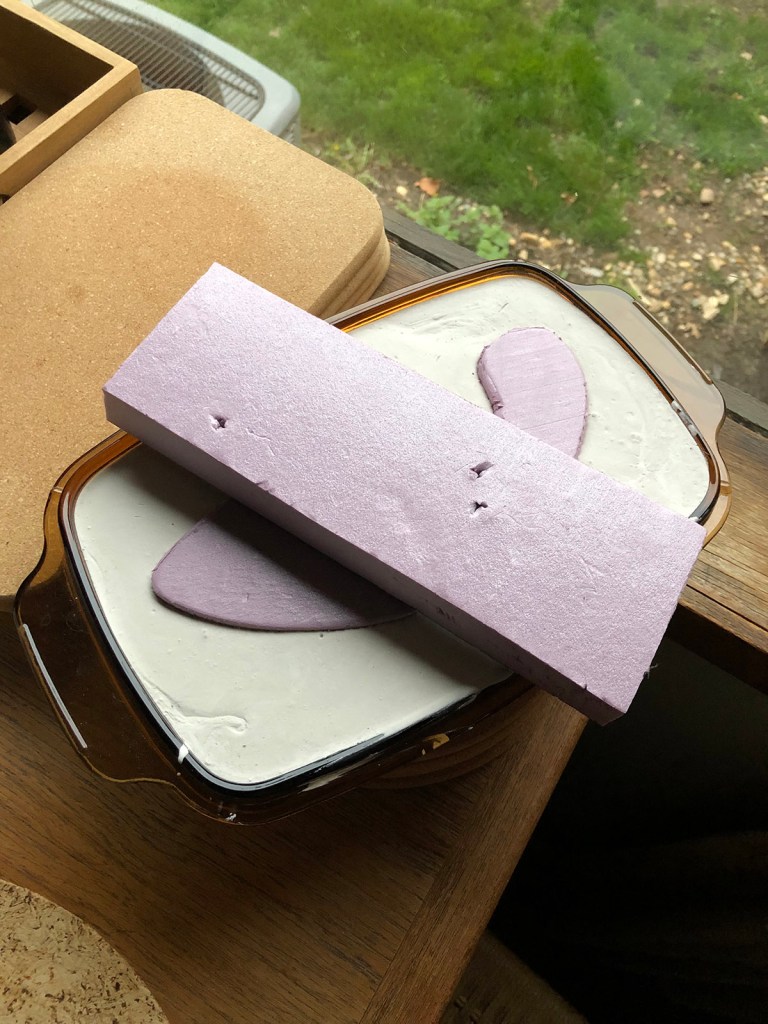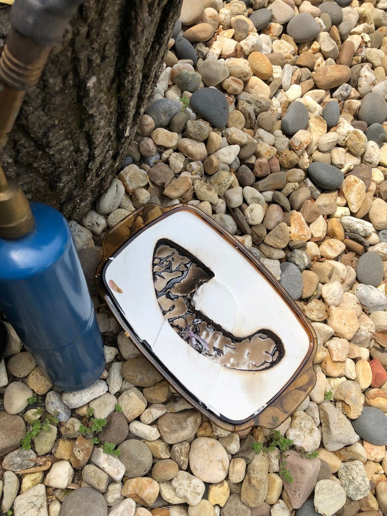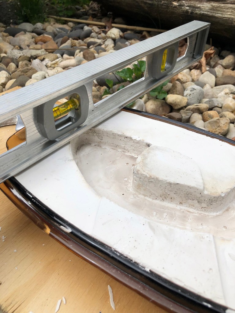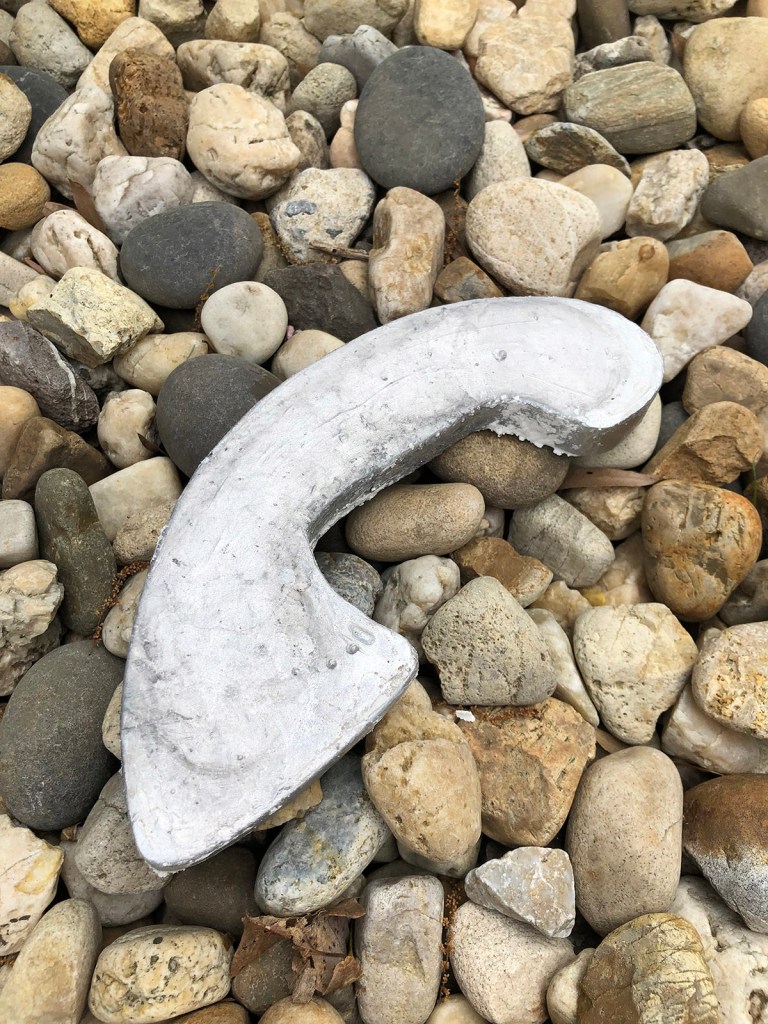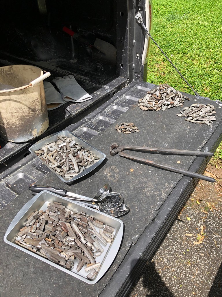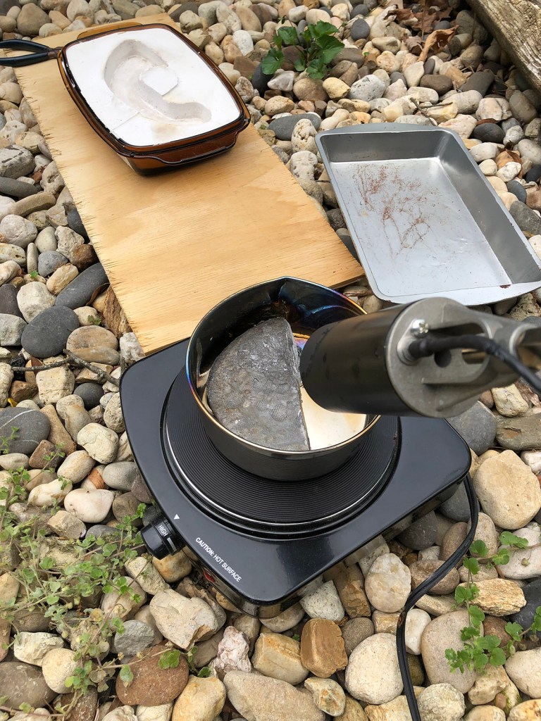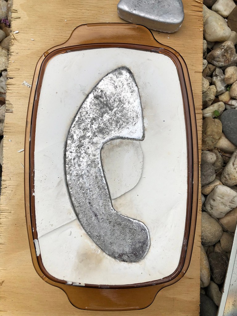 I traced a photo of the British Museum jumping weight onto a piece of styrofoam, and cut out the rough shape. I used styrofoam since it’s easy to shape, inexpensive, and would be easy to de-mold using heat. I then did a small amount of sanding on the foam to round the edges to better match the originals, and to make sure that it would leave a good impression in the mold. I used an old Pyrex casserole dish from a thrift store to make the plaster mold of the foam sculpture. I let the plaster cure for a week to make sure as much of the moisture was out as possible for safety, since I would be pouring hot metal into it and didn’t want any popping or cracking. To remove the foam without damaging the plaster mold, I used a propane torch to burn out the foam. Styrofoam shrinks quickly under high heat, and made it simple to de-mold. One the styrofoam cooled, the remaining bits were crisp, easy to remove, and snapped right out without leaving any mess.