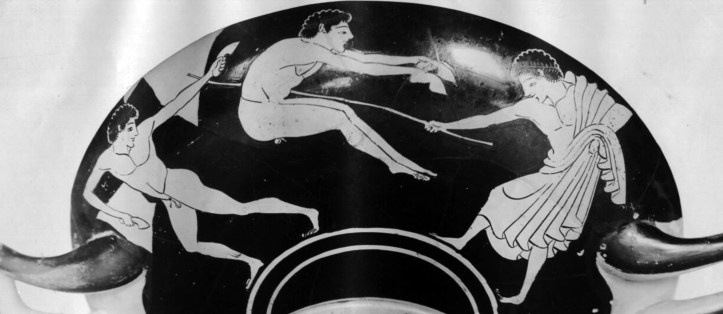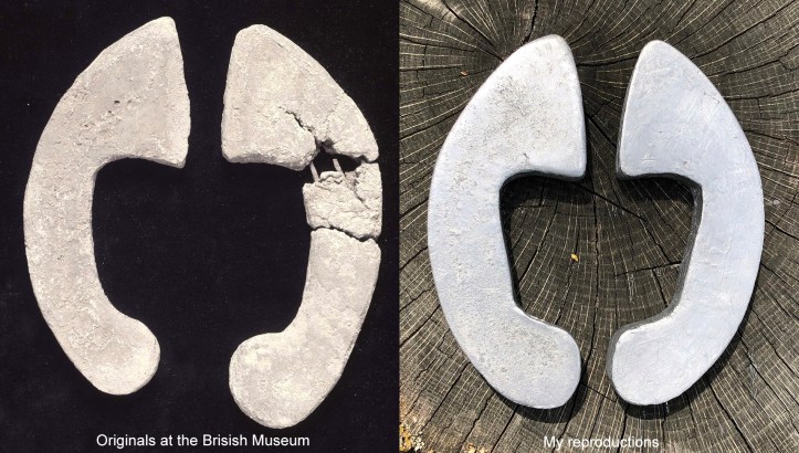 Weights (halteres) were commonly used in jumping events, and in athletic training. Halteres were made from stone, lead, and bronze. They came in a variety of shapes and sizes: some were clearly intended for youths, others were very large, with weights ranging from 1kg to 9kg. For our jumping competition I created a set of halteres modeled after a 5th century BCE set made from lead, located in the British Museum. Attached are images showing my final product, the originals upon which they’re based, and some process photos.